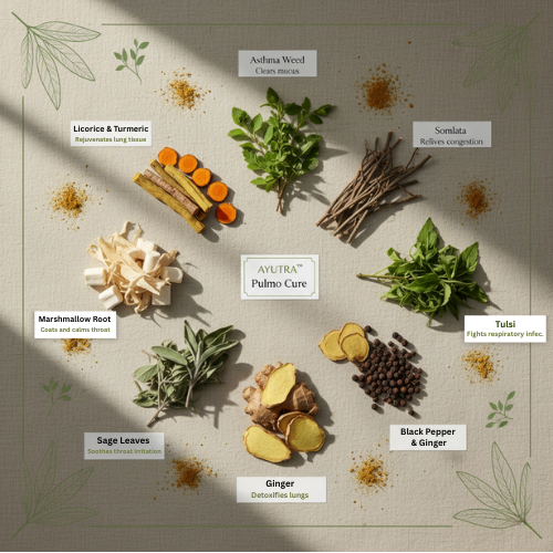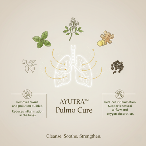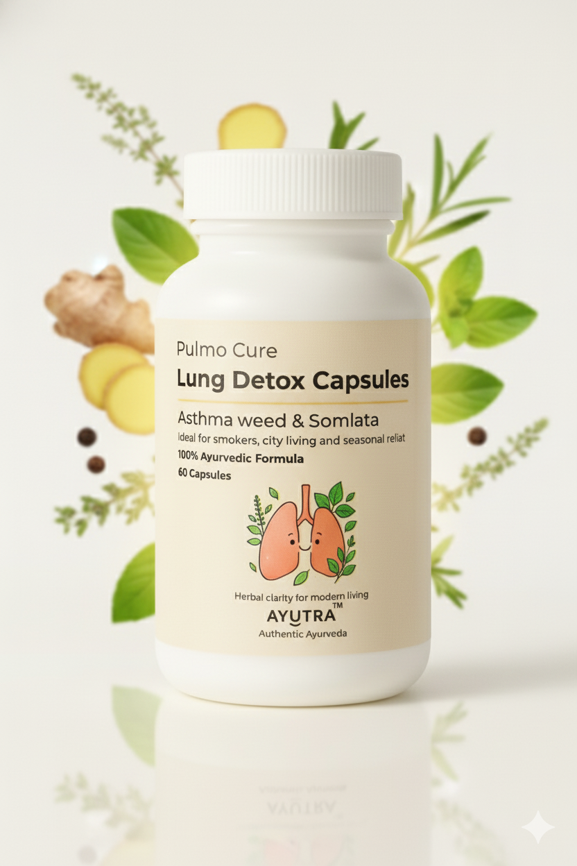AYUTRA™ Pulmo Cure is a 100% Ayurvedic formula designed to naturally detoxify, strengthen, and rejuvenate your lungs. Crafted with Asthma Weed (Euphorbia hirta), Somlata (Ephedra gerardiana), and Tulsi, this blend supports better breathing, helps clear congestion, and restores lung vitality — especially for those exposed to pollution, smoke, or allergens.