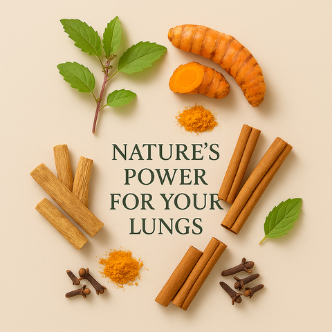 - 🌿 Tulsi (Holy Basil) – Rich in antioxidants and antimicrobial compounds that protect the lungs from infections, allergens, and environmental stress.